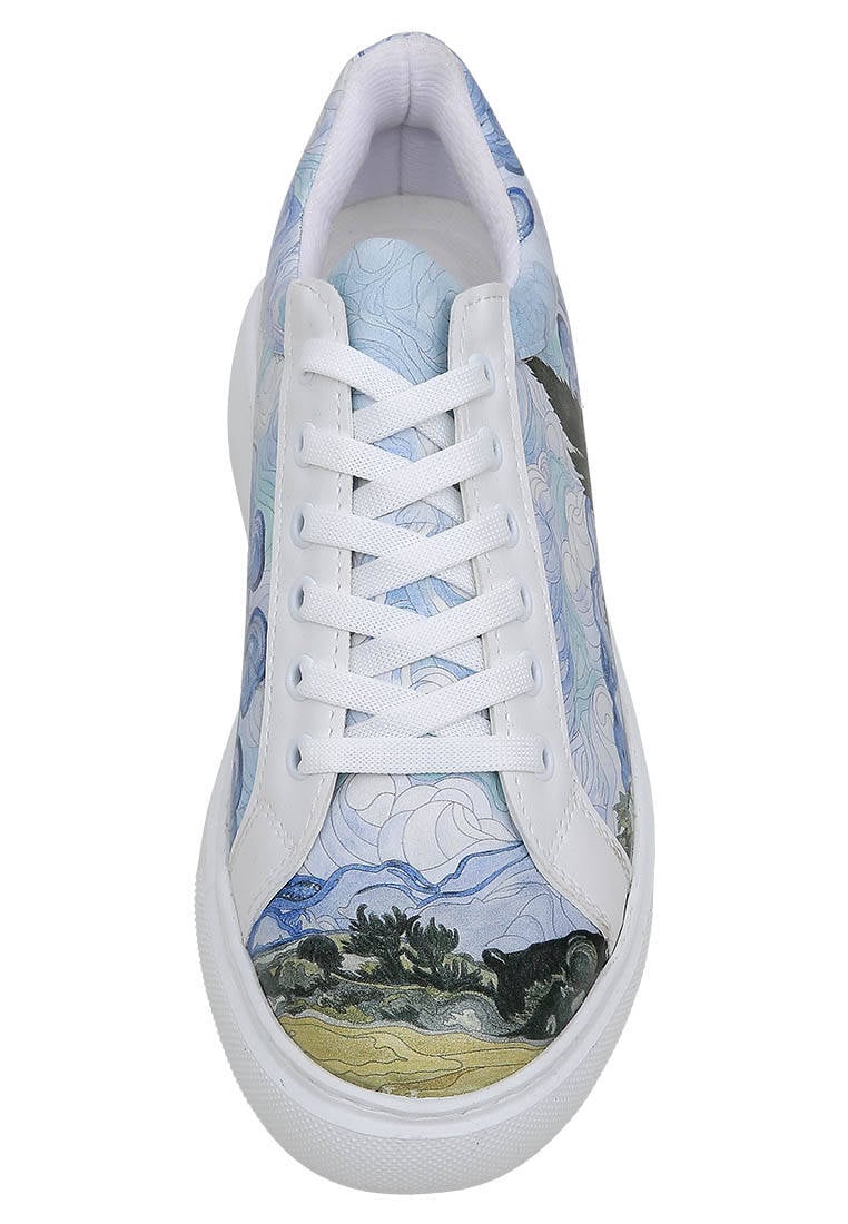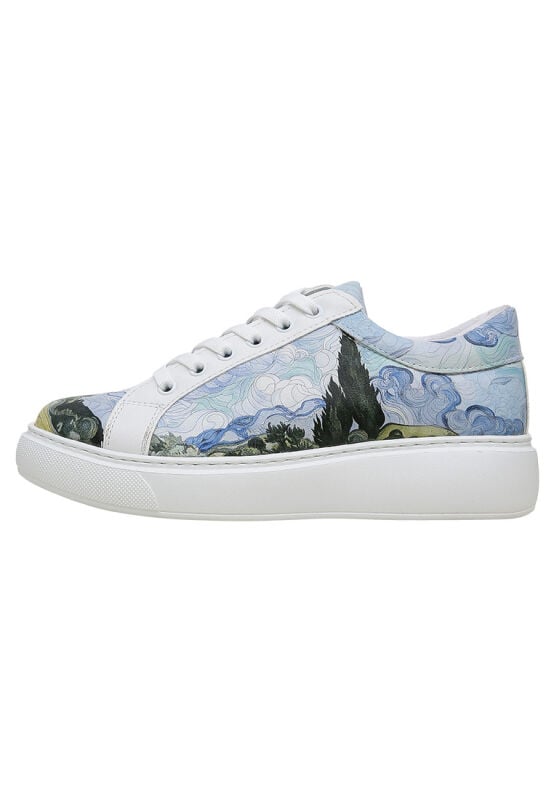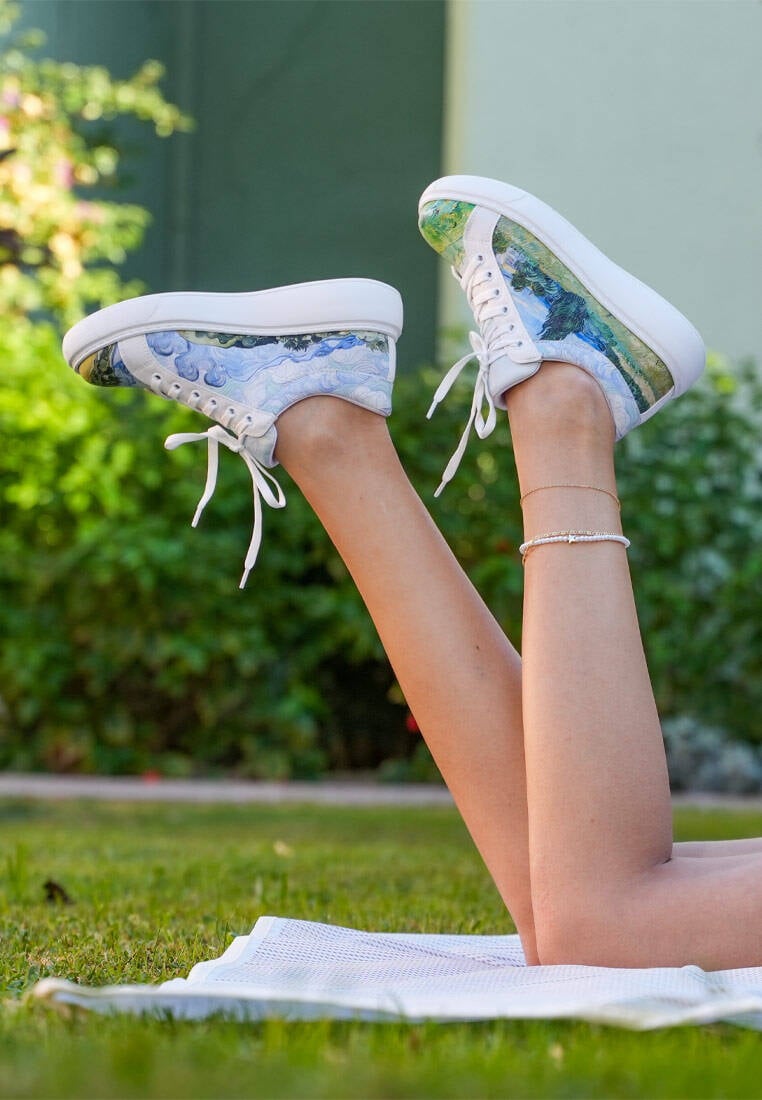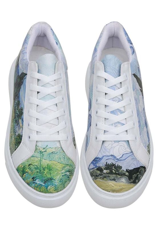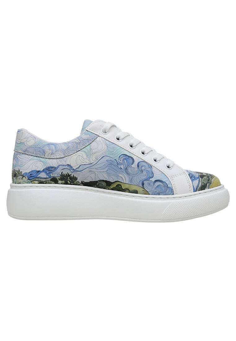 Portez l'art à chaque pas ! Les baskets blanches vegan en cuir pour femmes – Design Vincent van Gogh A Wheat Field with Cypresses, un modèle Dogo Pulse, insufflent à votre style l'esprit de l'art à travers leurs éléments de design détaillés. Conçues en cuir vegan 100 %, elles sont un choix respectueux de la planète, tout en offrant un confort léger toute la journée. Choisissez-les pour vous-même ou inspirez vos amis amoureux de l'art avec ces baskets idée cadeau ! Le Design Van Gogh apporte une touche artistique à votre style !