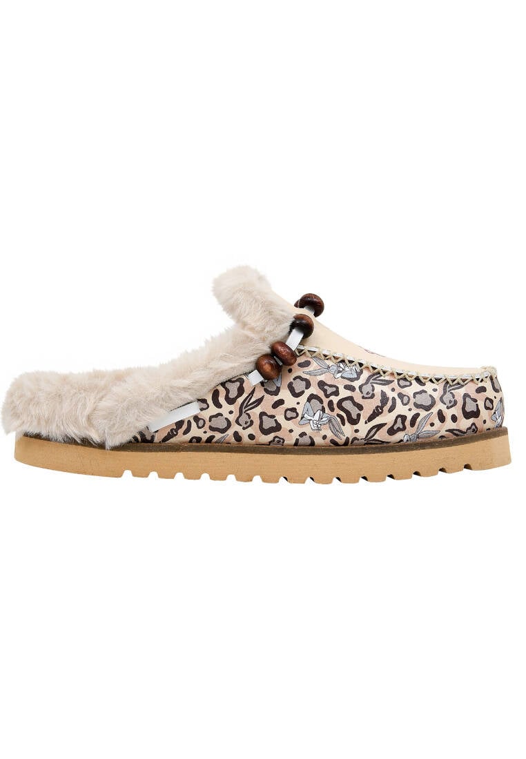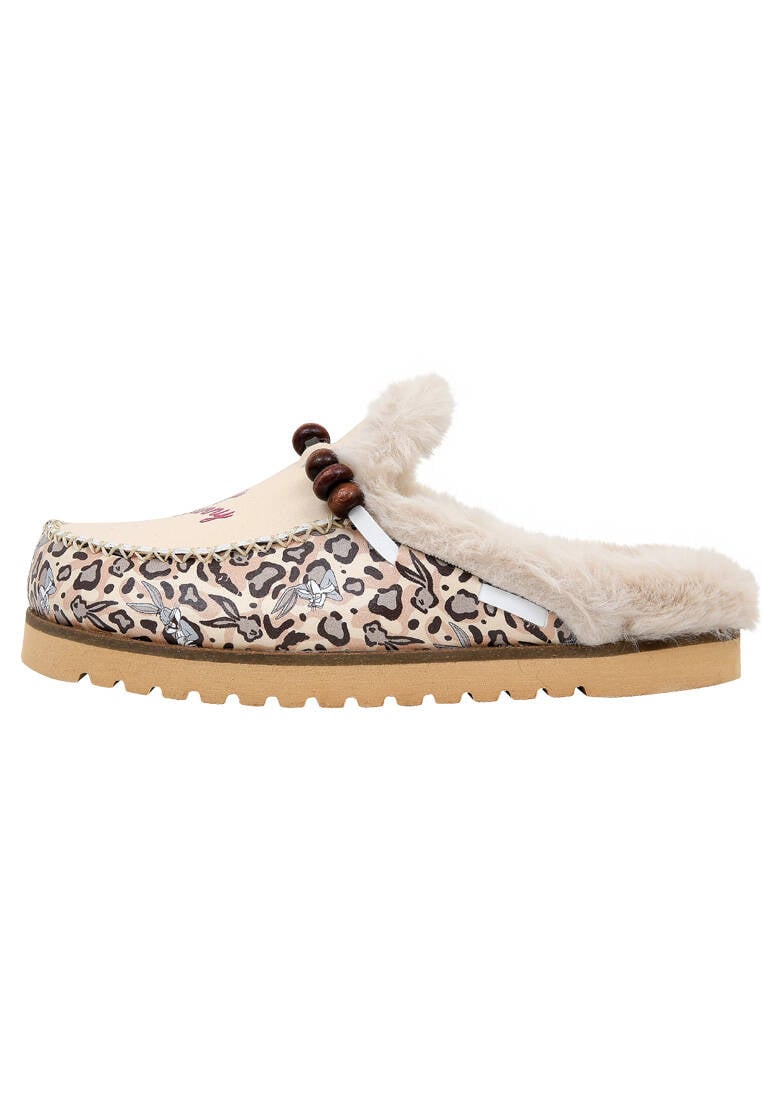 Femme Cuir Vegan Crème Chaussons Doublées en Peluche - Warner Bros Leopard Bugs Bunny Motif