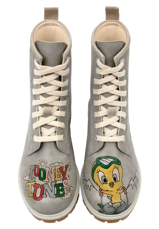 Les bottes hautes en cuir végan gris pour femme Design Warner Bros Tweety Looney Tunes Ski Club insufflent une touche ludique au style hivernal avec leurs détails inspirés de Titi. L’élégance des tons gris rencontre l’univers joyeux de Looney Tunes, apportant énergie et originalité à la mode urbaine. Fabriquées en cuir végan de haute qualité, elles allient confort et durabilité. En associant la silhouette classique de la botte haute à des détails contemporains, elles reflètent l’approche artistique de DOGO. Fidèles à la mode éthique avec une production 100 % respectueuse des animaux, elles ajoutent une note amusante, chaleureuse et distinctive aux tenues hivernales.