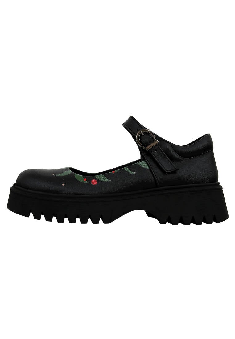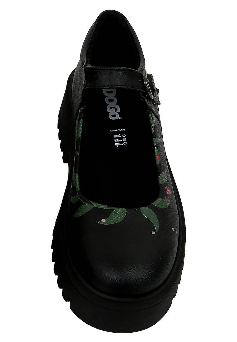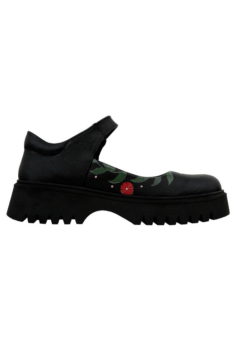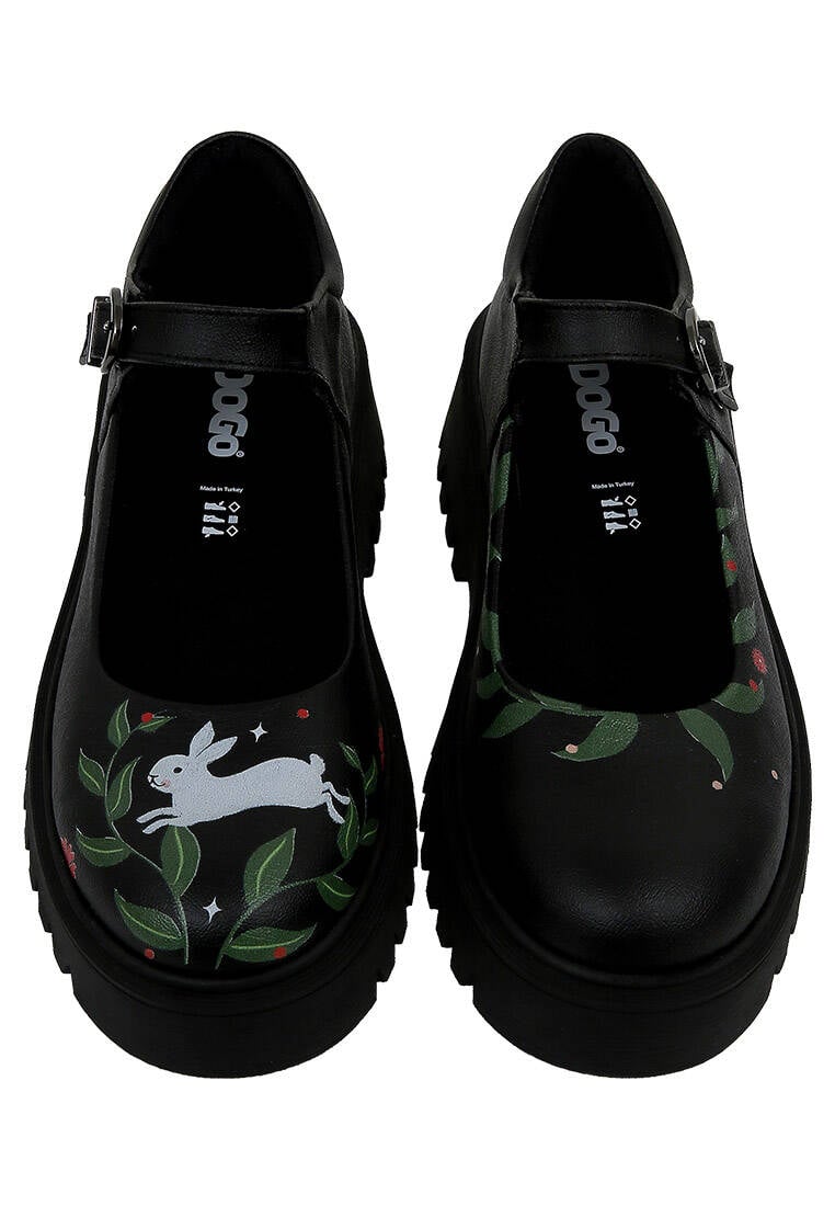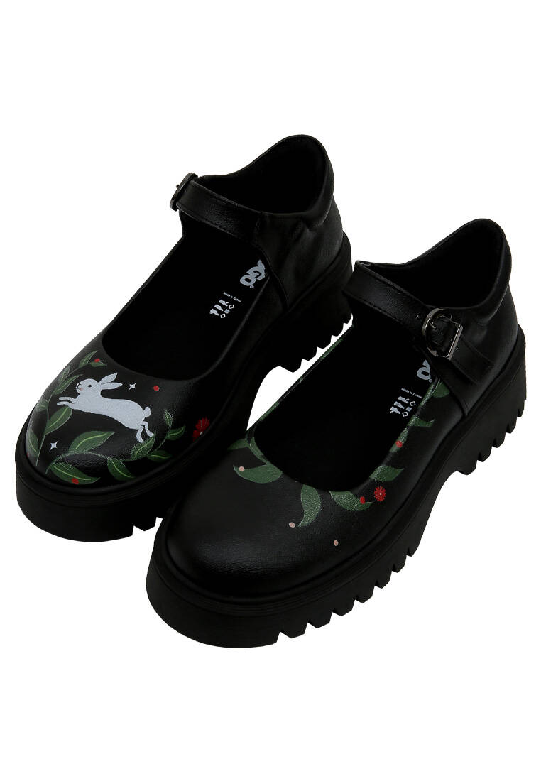 Femme Cuir Vegan Noir Mary Jane Mocassins - Bunny With Herbs Motif