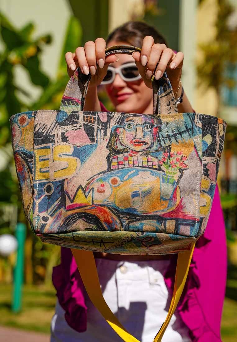 Alliez style et confort au quotidien ! Sac cabas moyen multicolore pour femme en cuir vegan – modèle Live and Save, collection Tag Bag Medium, embrasse une mode durable avec sa structure 100 % vegan, tandis que son design artistique sublime votre allure. Son intérieur spacieux et sa conception pratique en font un allié idéal du quotidien ou des escapades du week-end. À l’épaule ou à la main, exprimez votre style unique ! Pour vous ou en cadeau artistique et utile !
