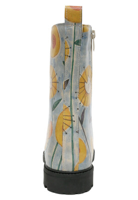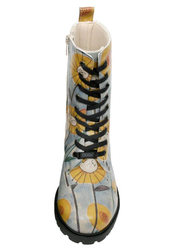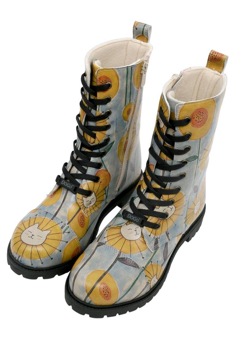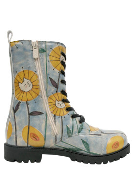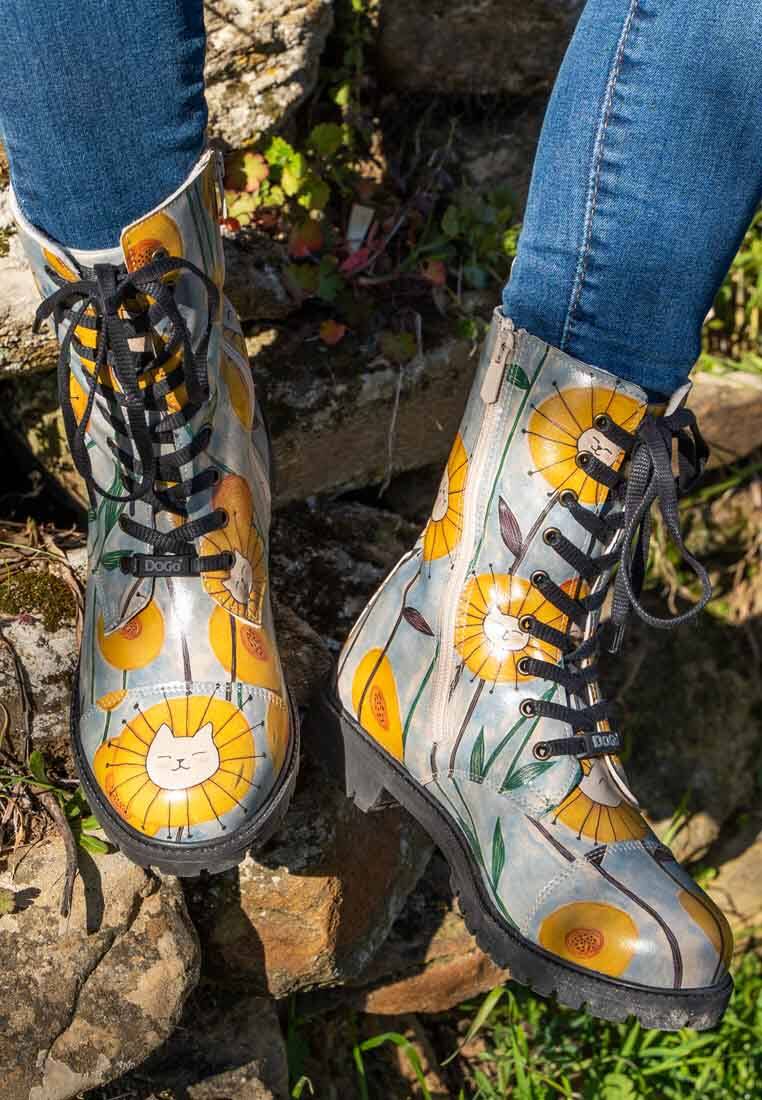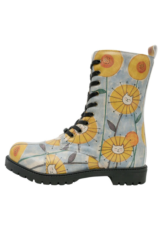 Femme Cuir Vegan Bleu Bottes Longues à Glissière - Cat Flower Motif