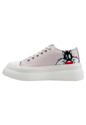Kadın Vegan Beyaz Kalın Taban Sneakers - Warner Bros Looney Tunes Tweety Sylvester Puddy Tat Tasarım