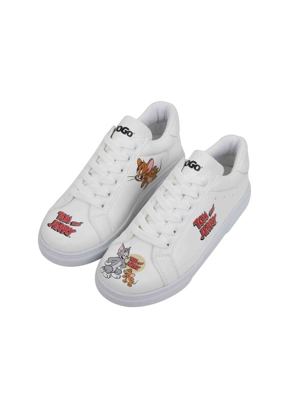 Kadın Vegan Deri Beyaz Sneakers - Warner Bros Tom ve Jerry Tasarım