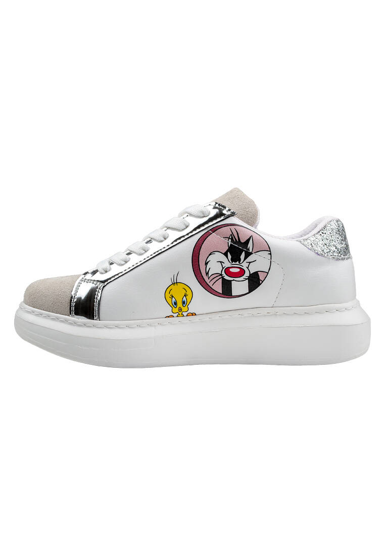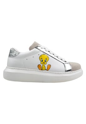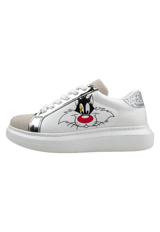 Kadın Vegan Deri Beyaz Sneakers - Warner Bros Tweety Sylvester Puddy Tat Tasarım