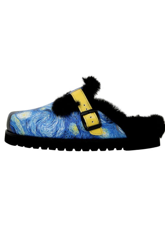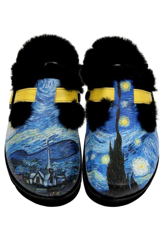Kadın Vegan Deri Mavi İçi Peluş Terlik - Vincent van Gogh The Starry Night Tasarım