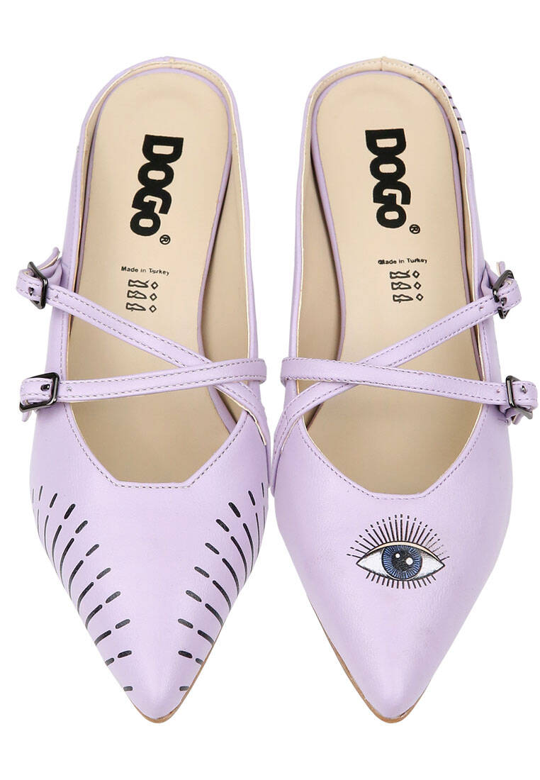 Embrace subtle elegance with the Kitty Heeled Sandals in lilac. These vegan shoes feature a minimalist 'Open Your Eyes' design with a charming eye motif. Perfectly designed for women, their short heels ensure comfort without compromising style.