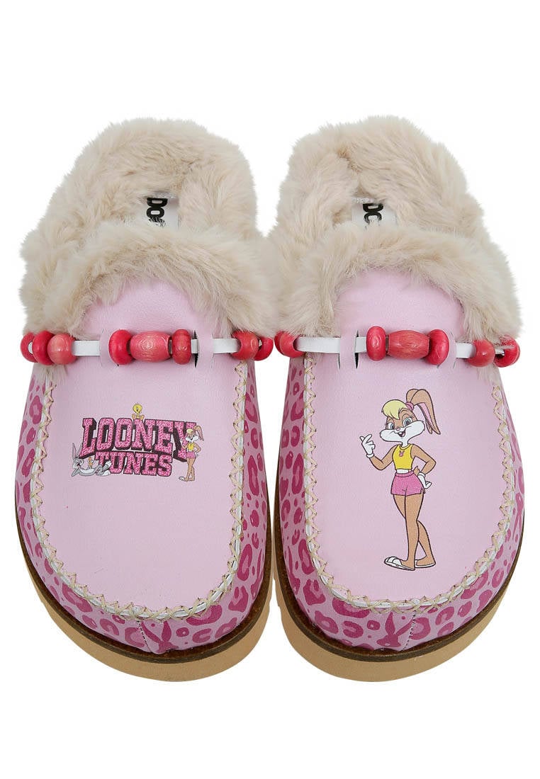 Women Vegan Leather Pink Plush Lined Slippers - Warner Bros Pink Leopard Lola Bunny Design