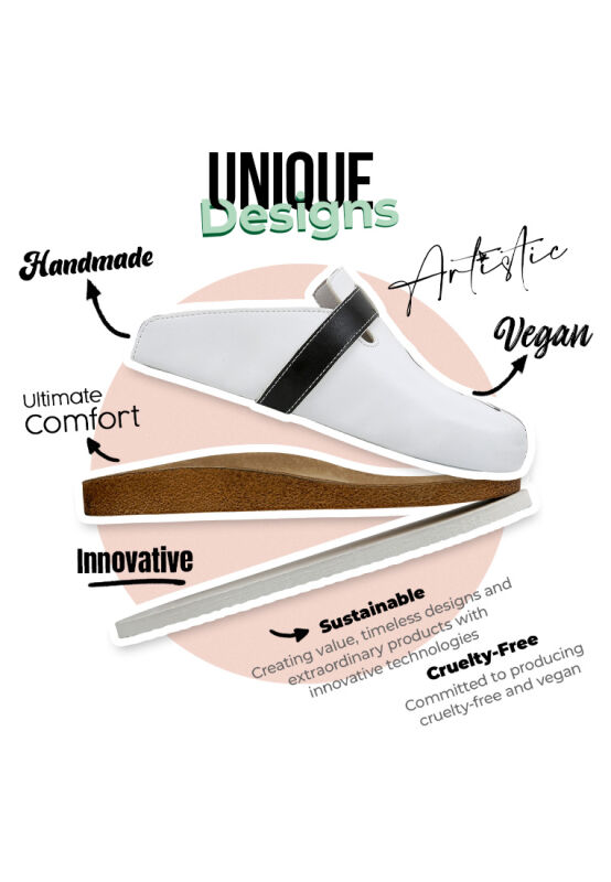 Comfie Women’s Vegan Leather White Slippers – Where My Spots At Design, show off your timeless style! Featuring minimalist lines blended with modern details, this iconic slipper model makes an effortless fashion statement. With 100% vegan materials, it’s a stylish yet conscious choice, offering ultimate comfort with its cork sole. This design seamlessly elevates any outfit, making it the perfect choice for those who love simplicity with a statement. Whether in the city or on vacation, your style will always be a step ahead. Choose it for yourself or make a stylish and modern slipper gift to a loved one!