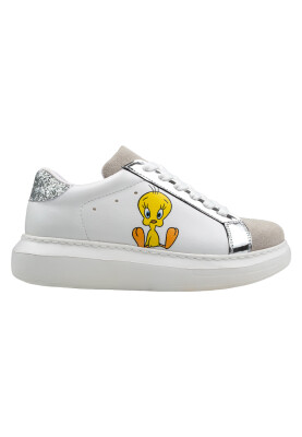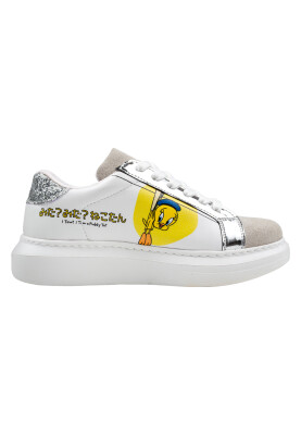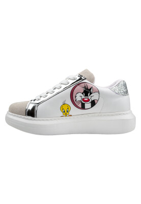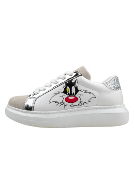 Women Vegan Leather White Sneakers - Warner Bros Tweety Sylvester Puddy Tat Design